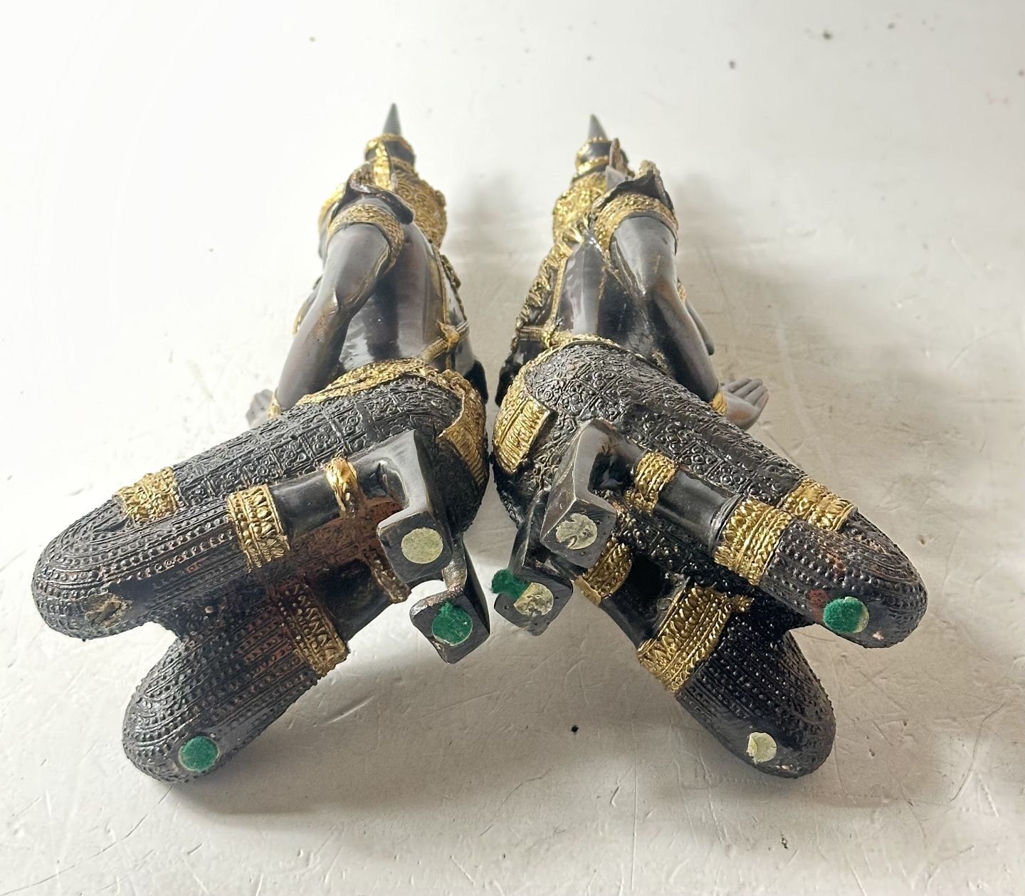 Par buddhaer / tempelvogtere udført af patineret bronze og messing. H. ca. 34 cm.