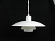 Poul Henningsen PH 4 pendel med skærme af hvidlakeret aluminium, hvid stofledning. Formgivet omkring 1958 og fremstillet hos Louis Poulsen. Diam. 40 cm.