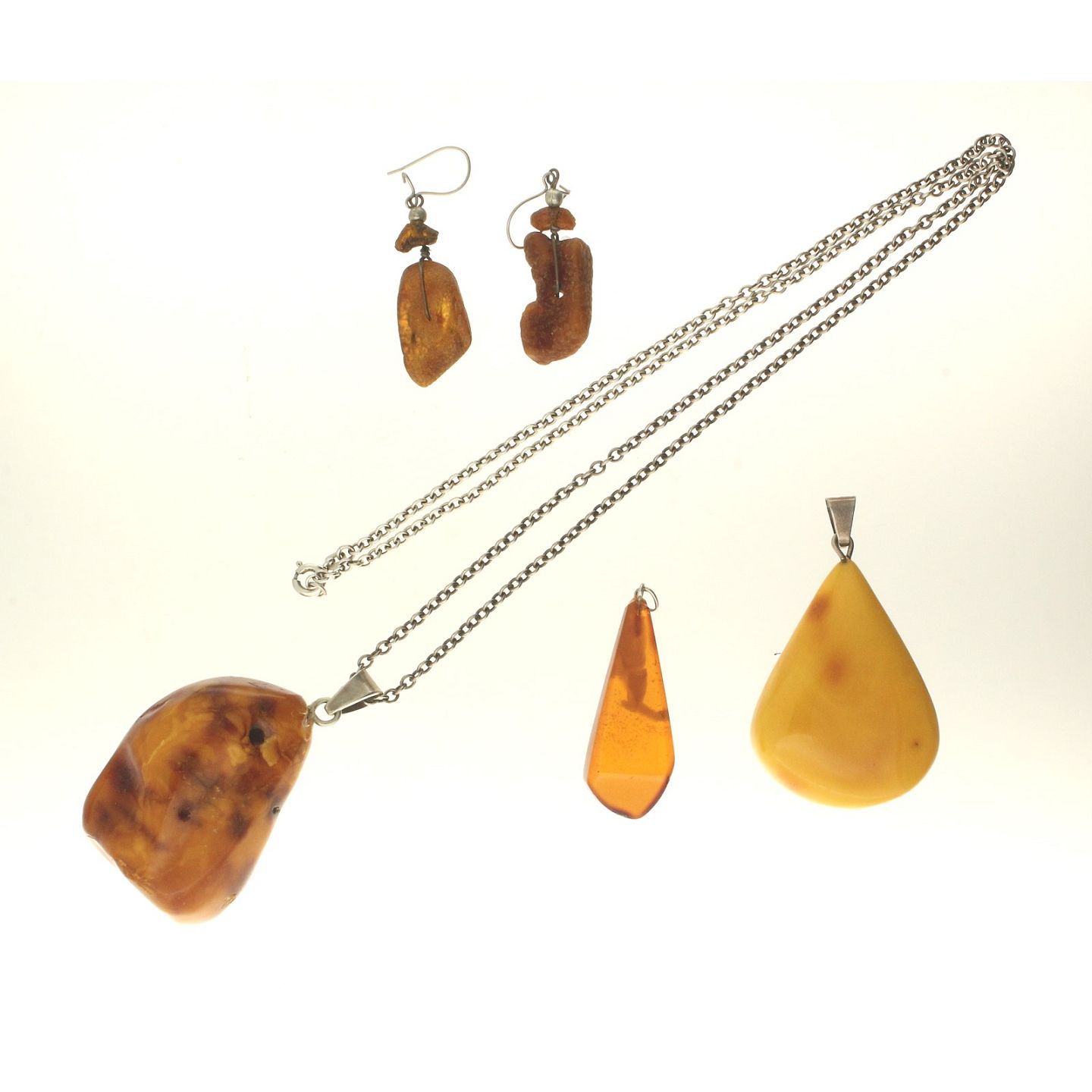Tre halskæder, en halskæde af sølv, tre vedhæng samt et par øreringe.