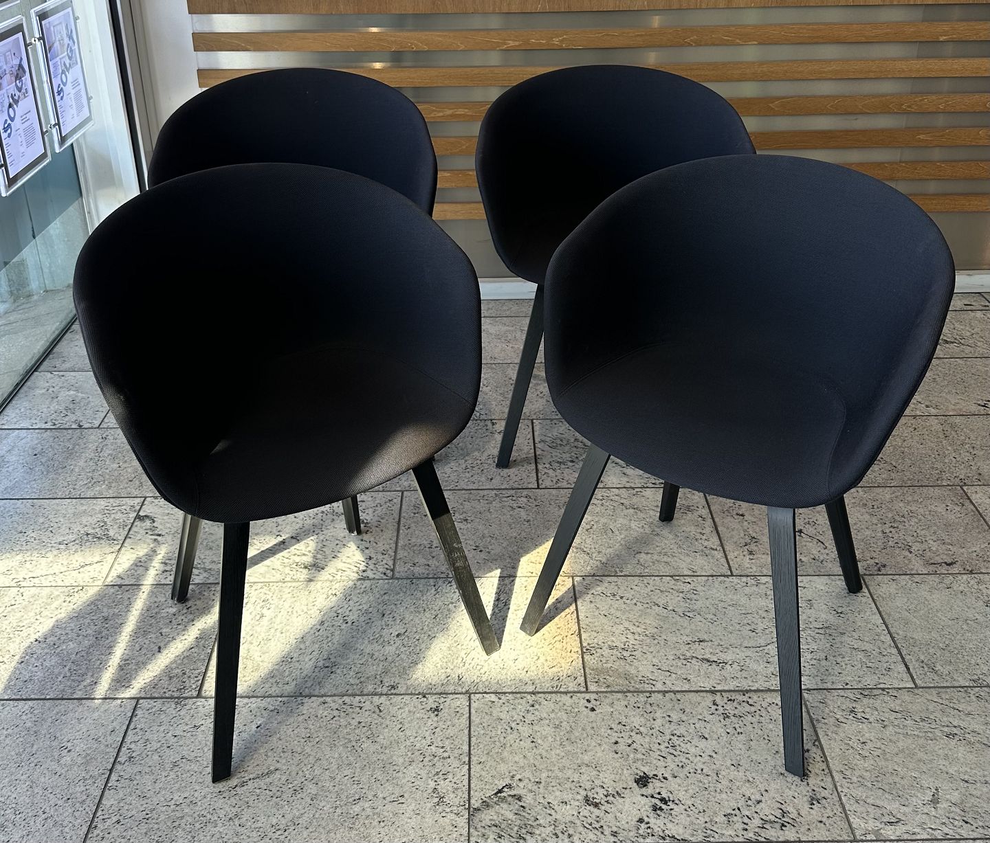 Hee Welling for HAY - Fire spisestole / armstole, model About A Chair med stel af sortlaseret egetræ, skaller betrukket med sort møbelstof.