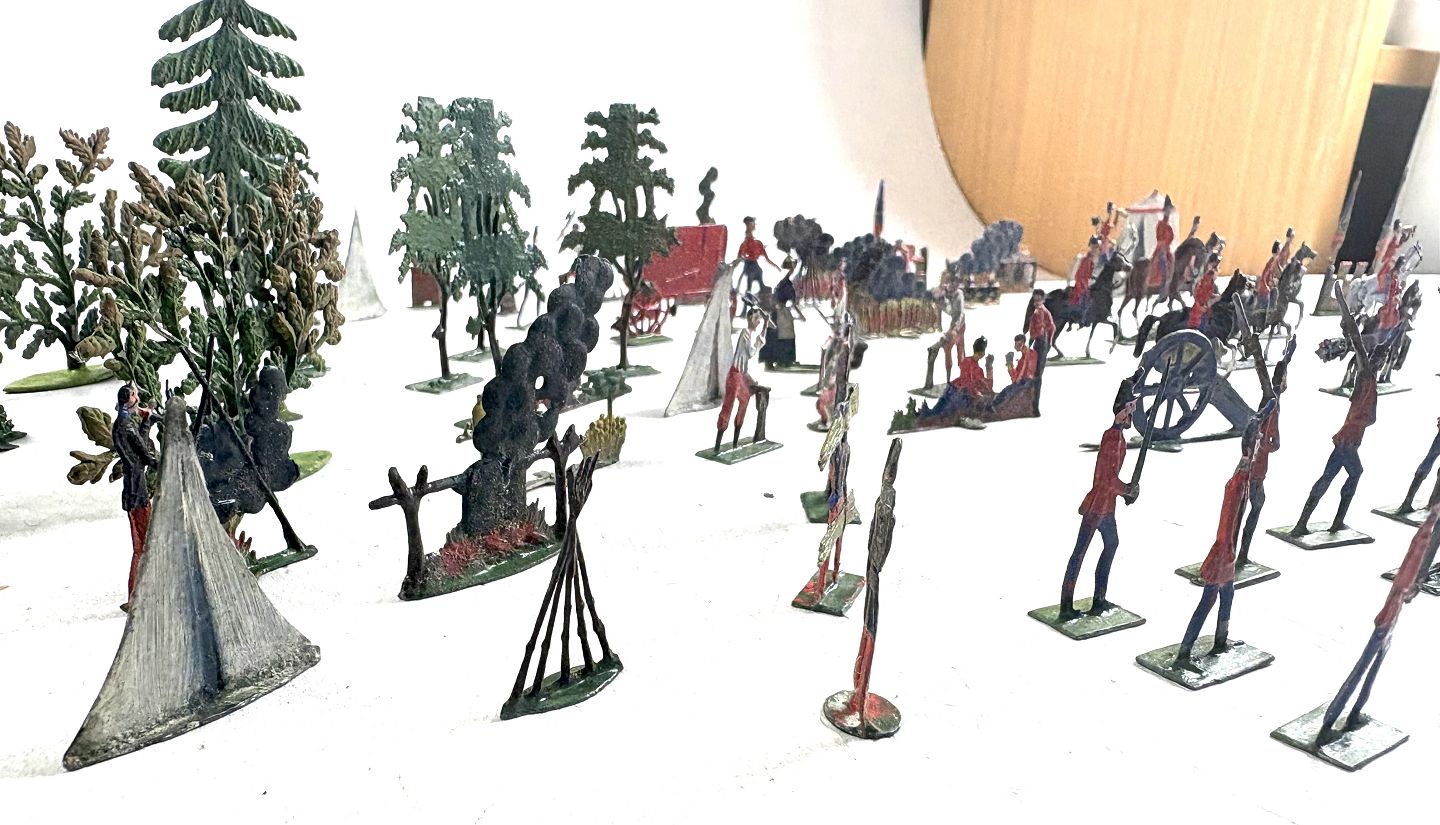 En samling miniature flade soldater inkl. diverse træer m.m. Udført af bemalet metal. H. ca. 4-9 cm.