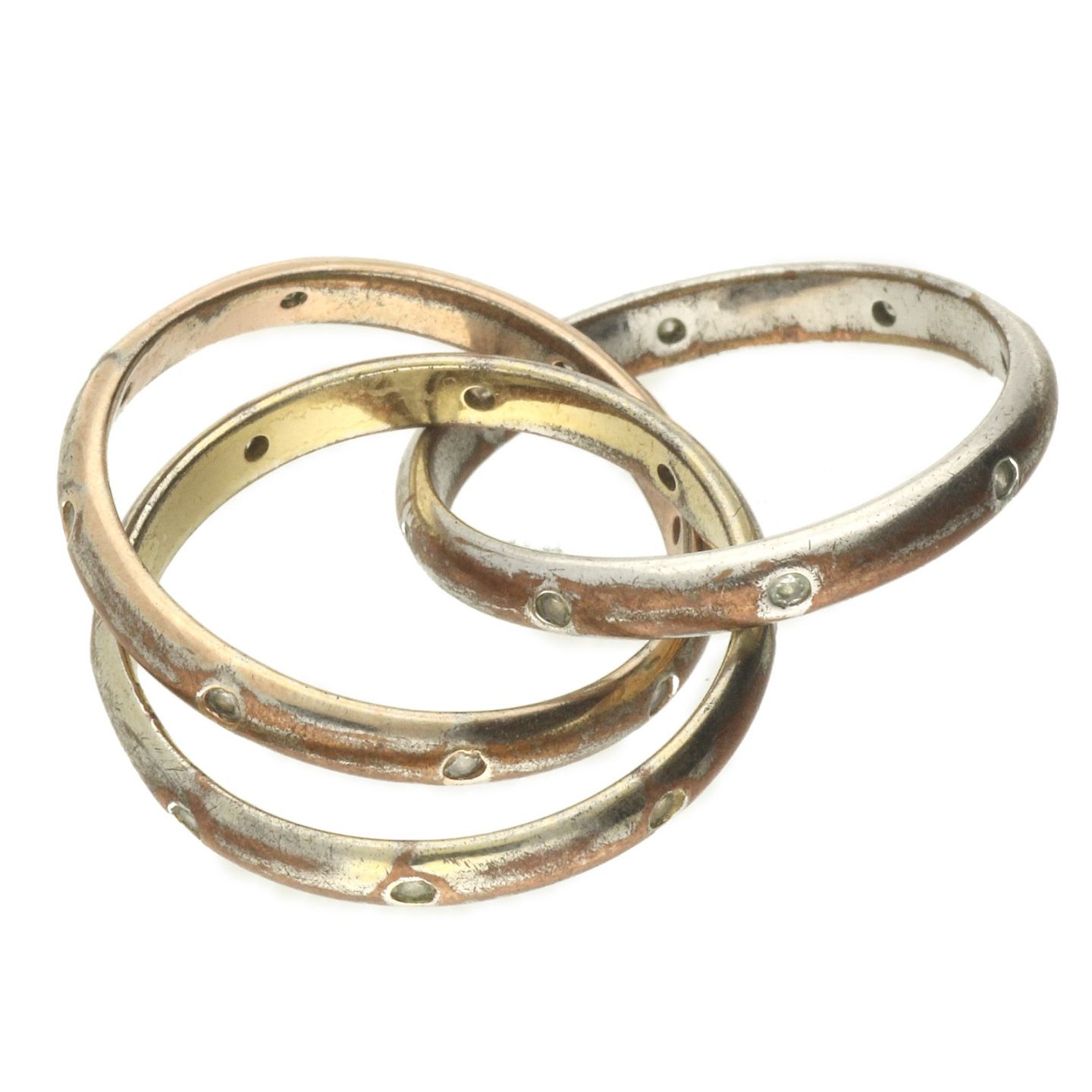 Tre-delt ring af metal fattet med klare sten. Ringstr: 51. Vægt: ca. 5,2 gr.