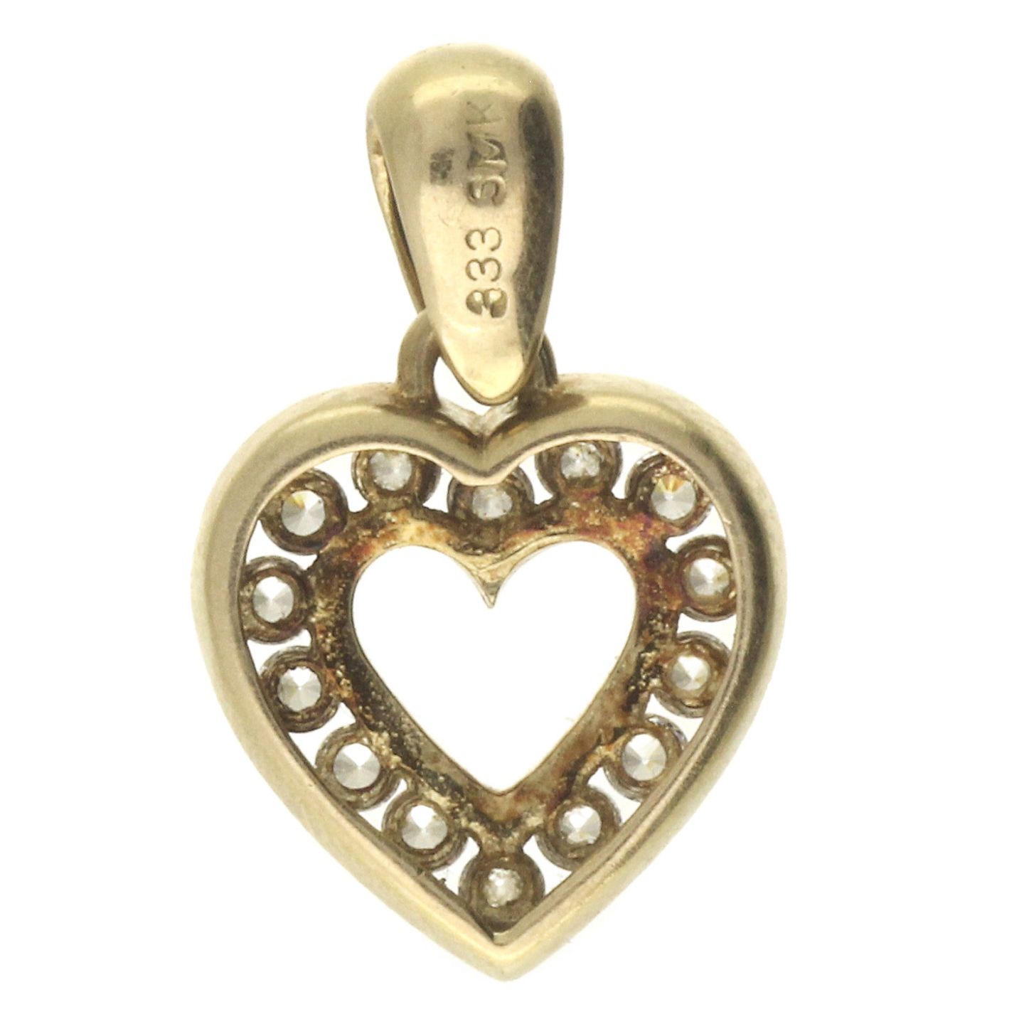 Hjertevedhæng af 8 kt. guld fattet med klare sten. L. inkl. øsken: ca. 1,7 cm. Vægt: ca. 1,32 gr.