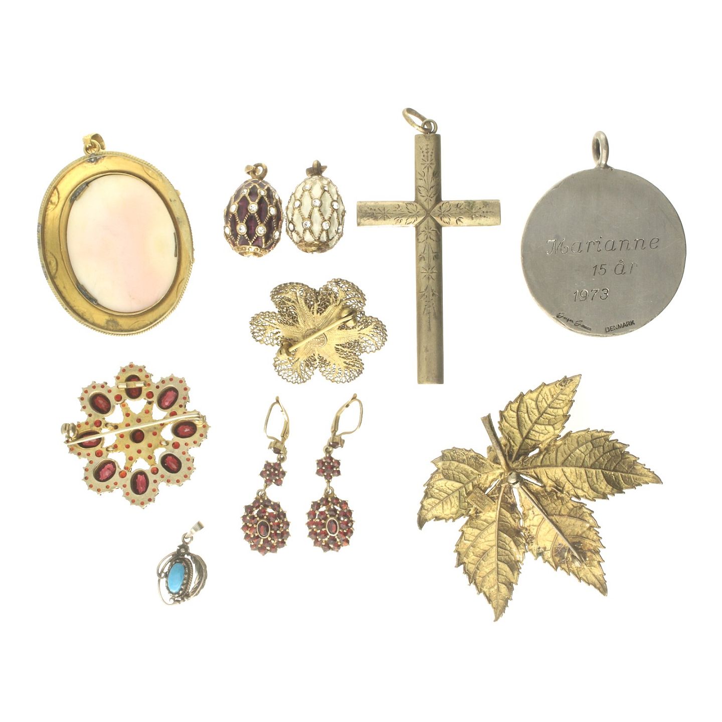 Fem dele af sølv, heriblandt øreringe samt broche af forgyldt sølv fattet med granater, forgyld flora danica broche af sterling sølv, forgyldt broche samt vedhæng af sølv.