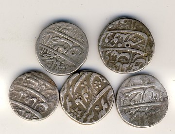 Indien, 5 sølvmønter 16-17. århundrede, ca. 11 gram/stk