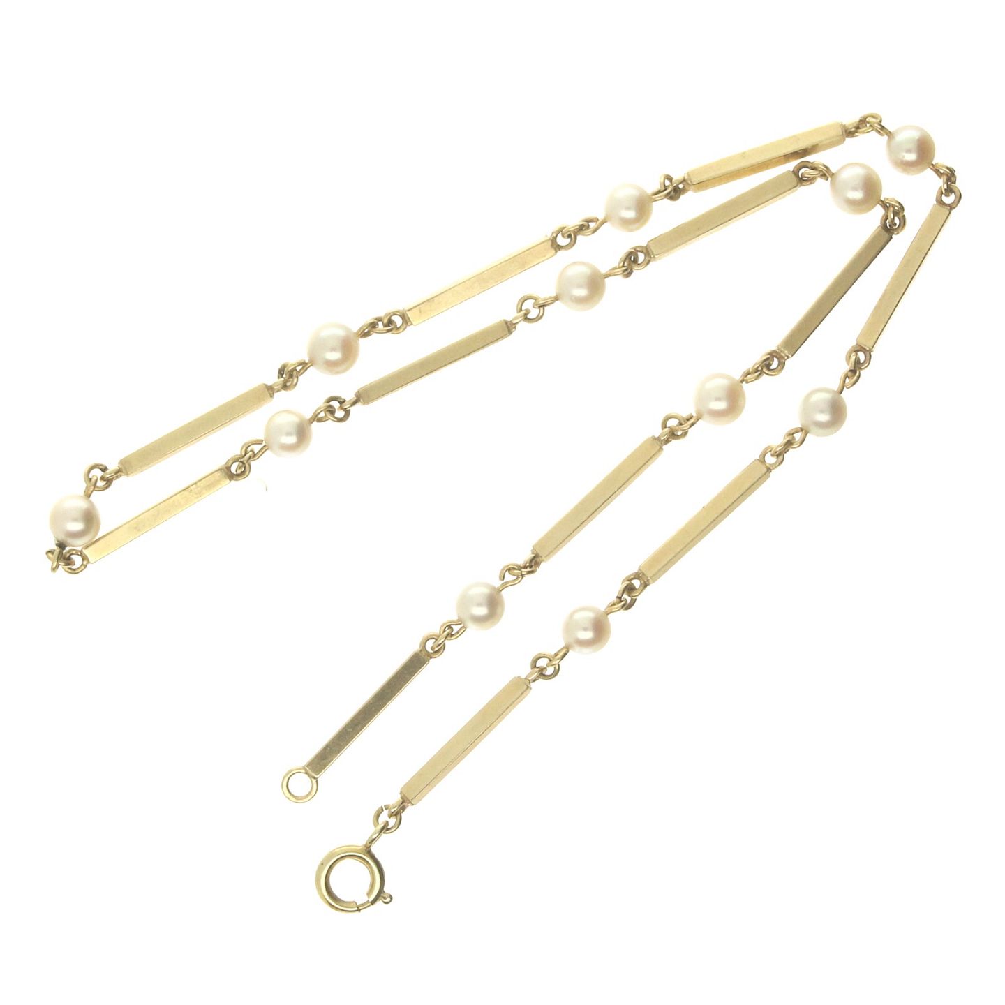 Leddelt halskæde udført af 14 kt. guld fattet med kulturperler. Ø. på perler: ca. 5 mm. L. på halskæde: 38,5 cm. Vægt: ca. 9,60 gr.