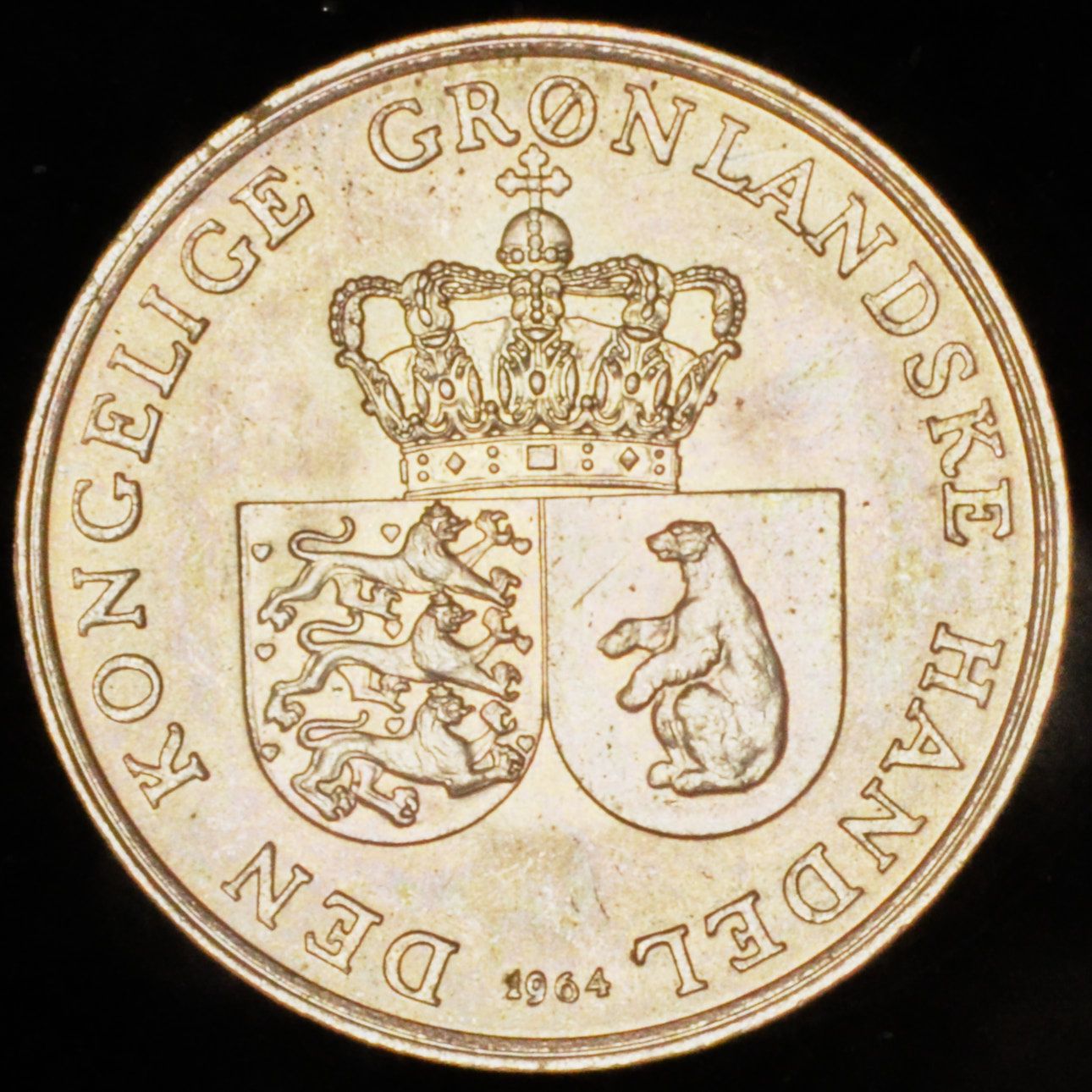 Grønland Styrelse og Den kongelige Grønlandske Handels mønter prægedes 1926-1964 på den Kgl. Mønt i København. 1 Juli 1967 blev de sidste grønlandske mønter inddraget.