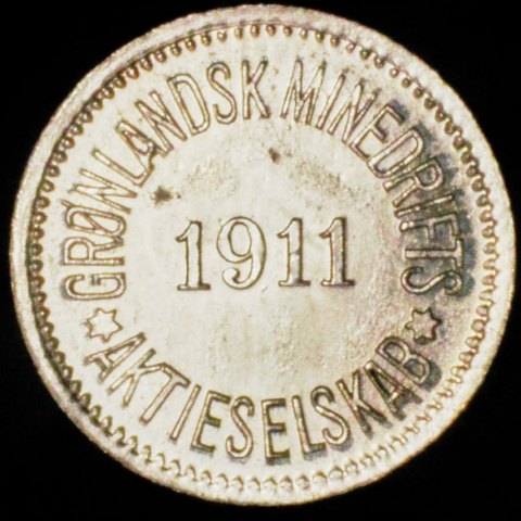 Aktieselskabet Grønlandsk Minedrift udvandt blandt andet kobber i Julianehåb området. Firmaet fik fremstillet dette private betalingstegn hos L. Chr. Lauer i Nürnberg.
