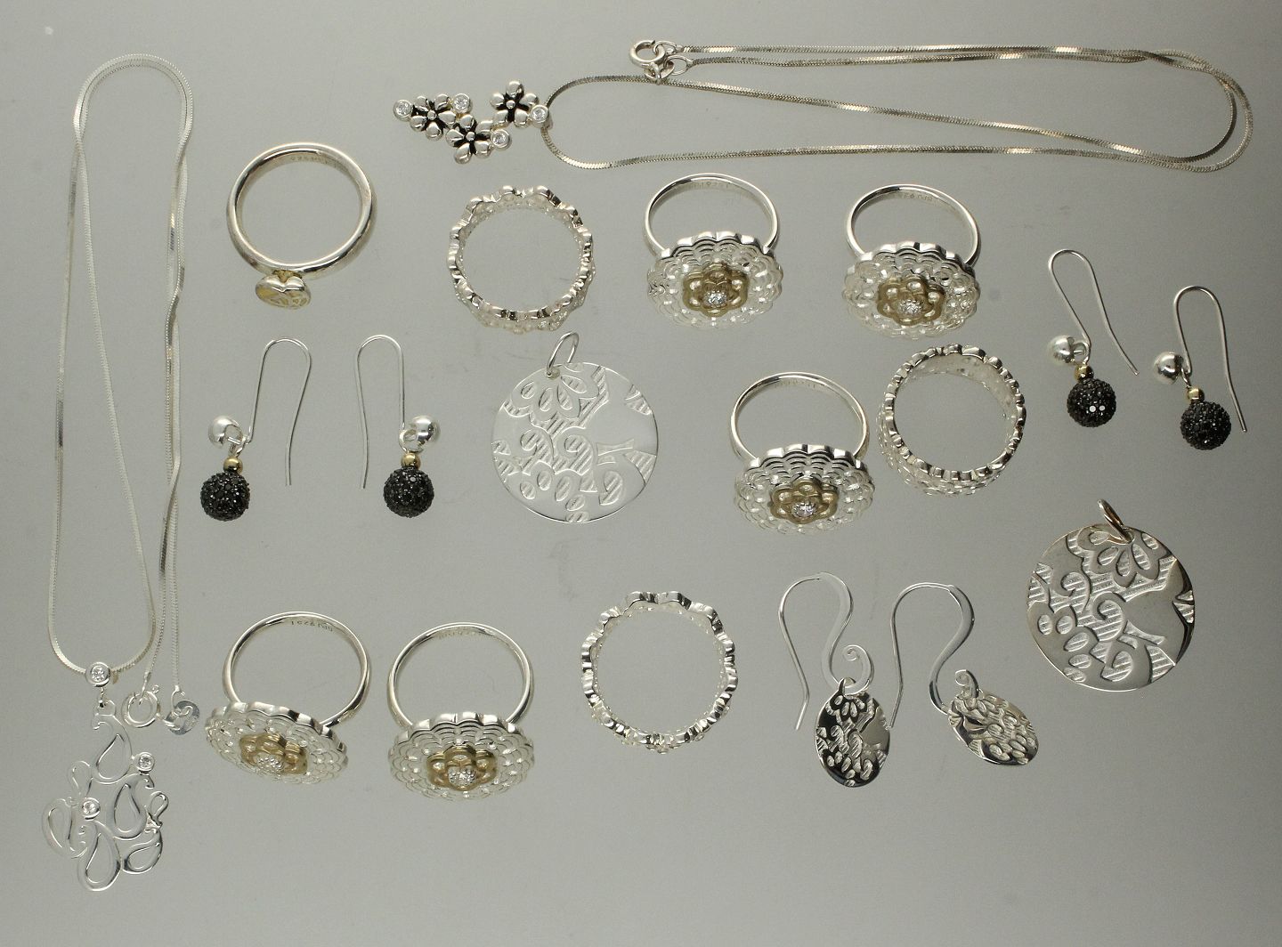 To vedhæng, to halskæder inkl. to vedhæng, tre par ørestikker samt ni ringe, str. 54-57. Samlet vægt: ca. 89 gr.