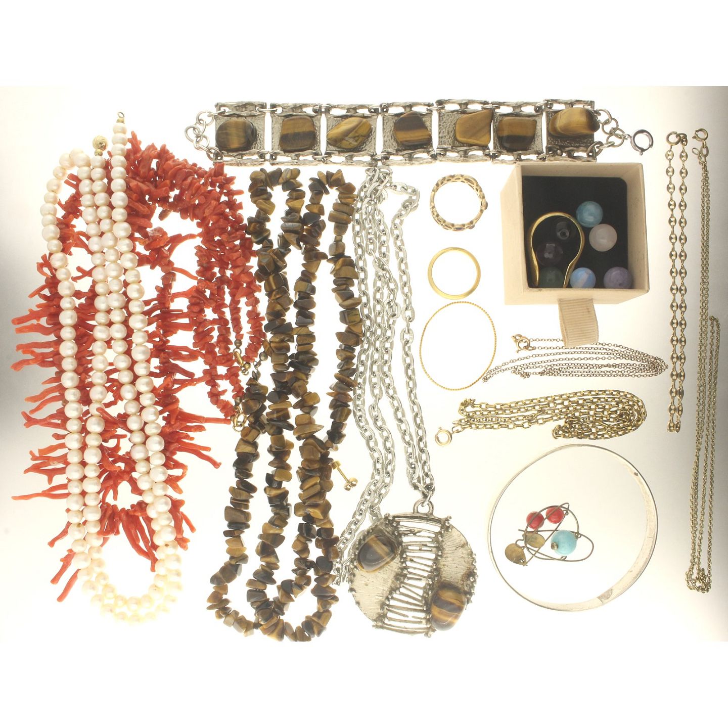 En koral halskæde, en perlehalskæde, et armbånd, fem diverse halskæde, en armring, et armbånd, tre ringe samt et vedhæng.