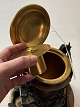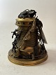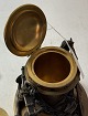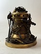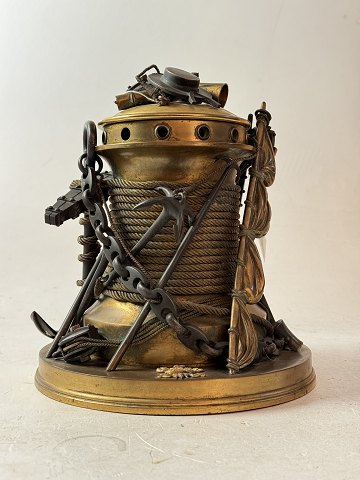 Engelsk tobakskrukke af patineret og forgyldt bronze, udformet som en skibspullert med reb, dekoreret med talrige maritime symboler som f.eks. anker, kæder og sejl, base prydet med Prinsen af Wales' emblem i form af strudsefjer, krone og valgsprog. Asprey & Son, London. Slutningen af ​​det 19. århundrede. H. 26 cm.