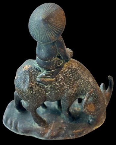 Vietnametisk bronzeskulptur i form af barn på bøffel. H. ca. 18 cm. Ca. 1970'erne.