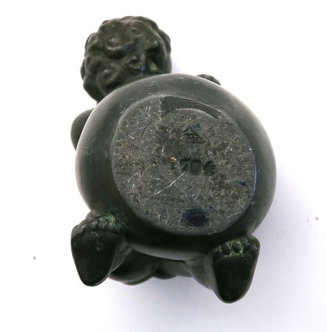 Just Andersen penneholder/blækhus af patineret diskometal i form af sovende dreng på krukke. H. 6 cm.
