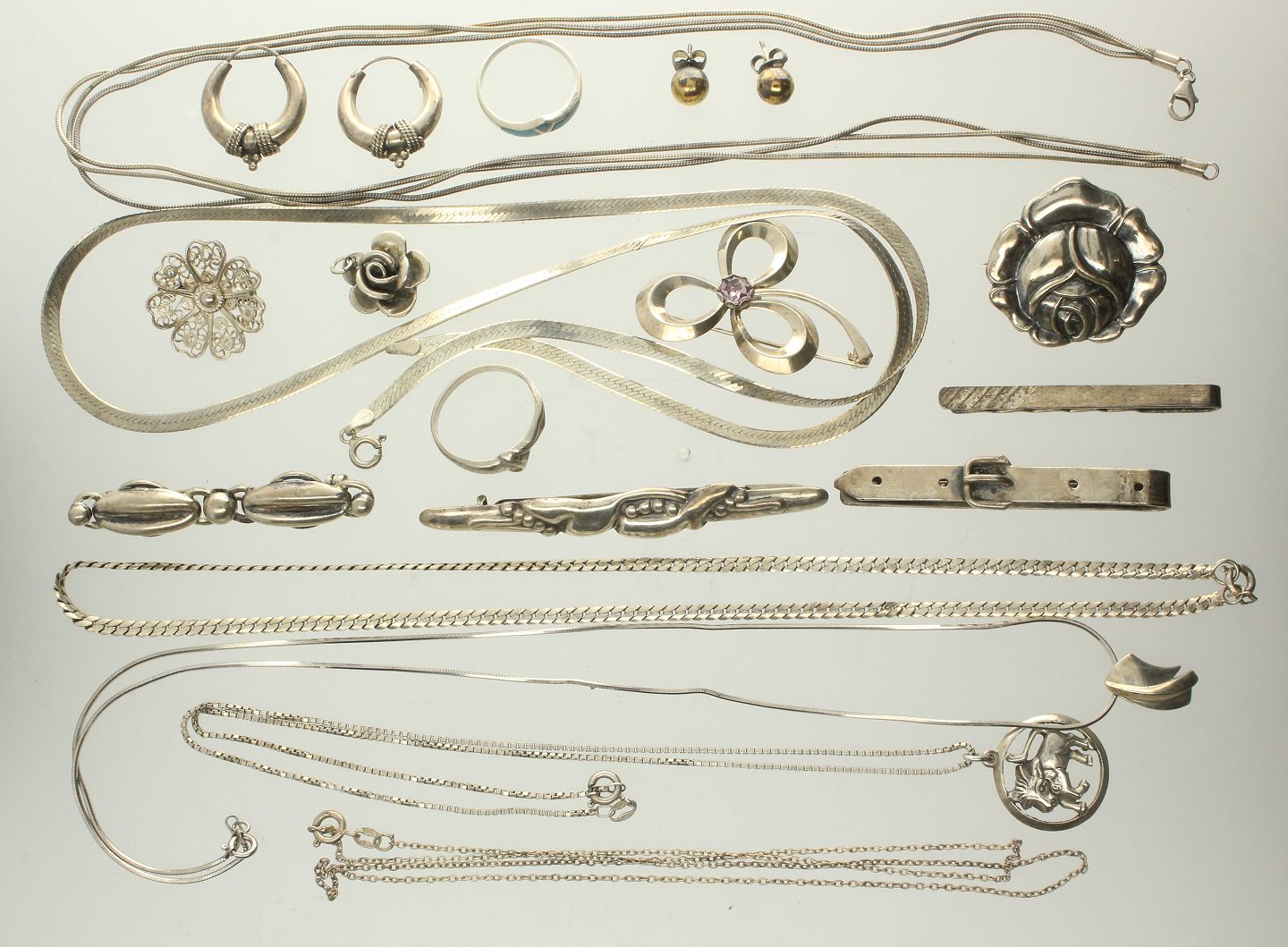 To slipsenåle, fem brocher, to vedhæng, to par øreringe, et vedhæng, to ringe samt seks halskæder. Samlet vægt: ca. 87,7 gr.