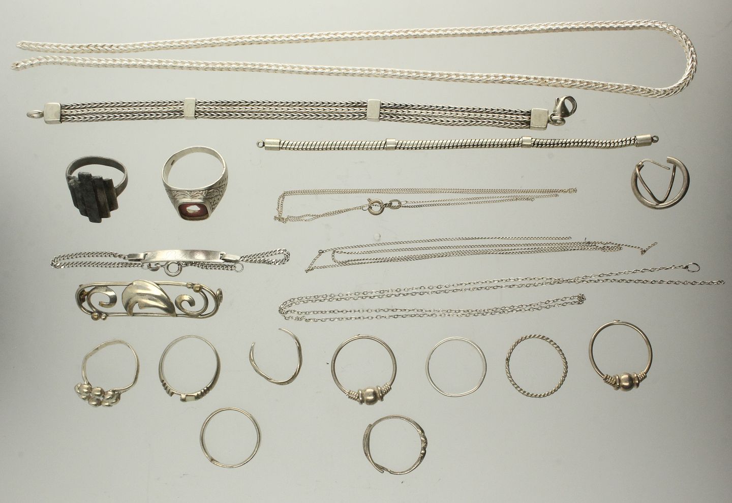 En samling defekte / ustemplet smykker af sølv. Samlet vægt: ca. 83 gr.