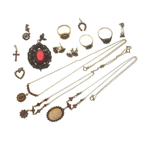 En samling granat smykker af sølv, størstedelen forgyldte (14)