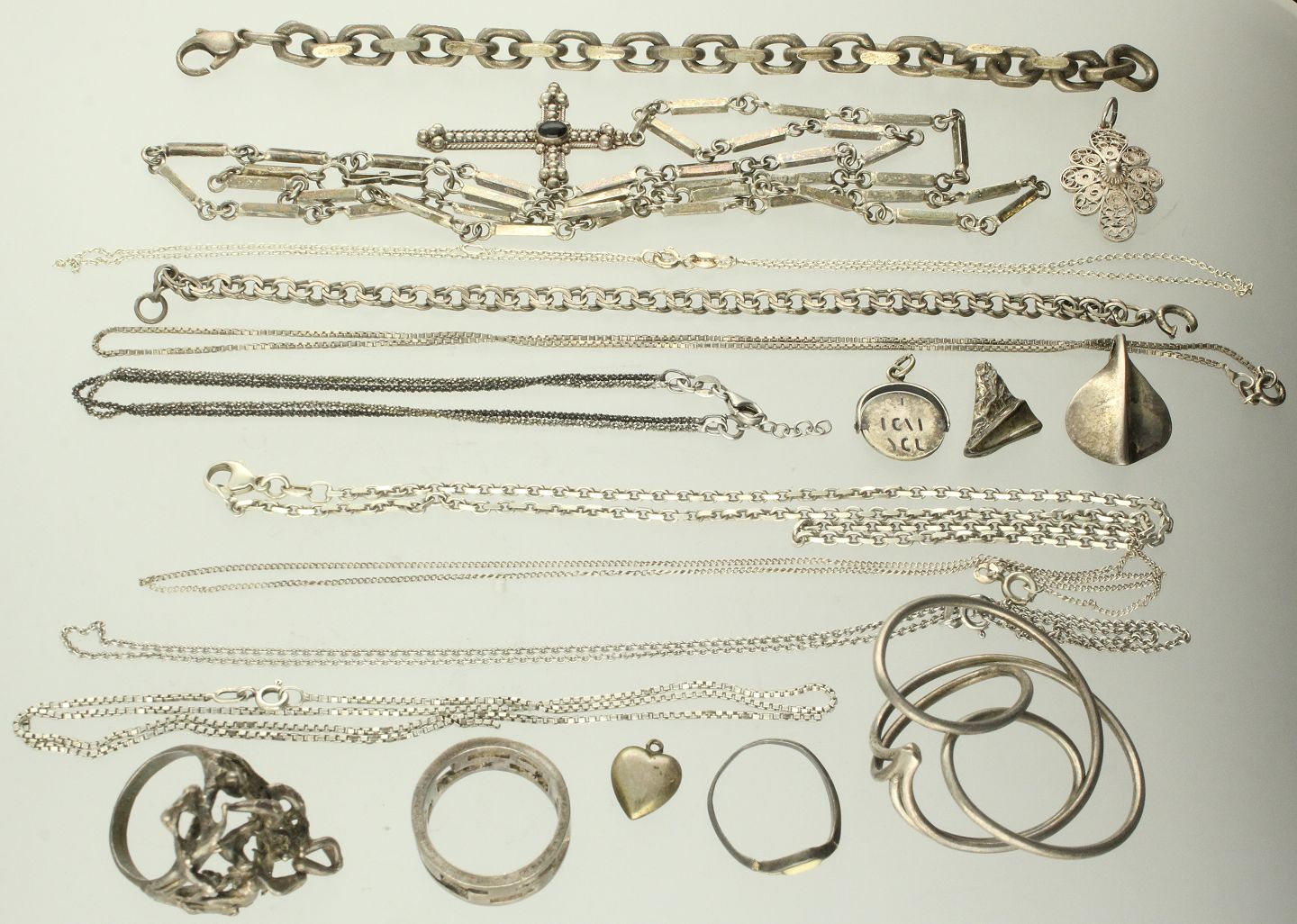 Seks vedhæng, et par ear cups samt to ringe, ringstr: 58 og 60