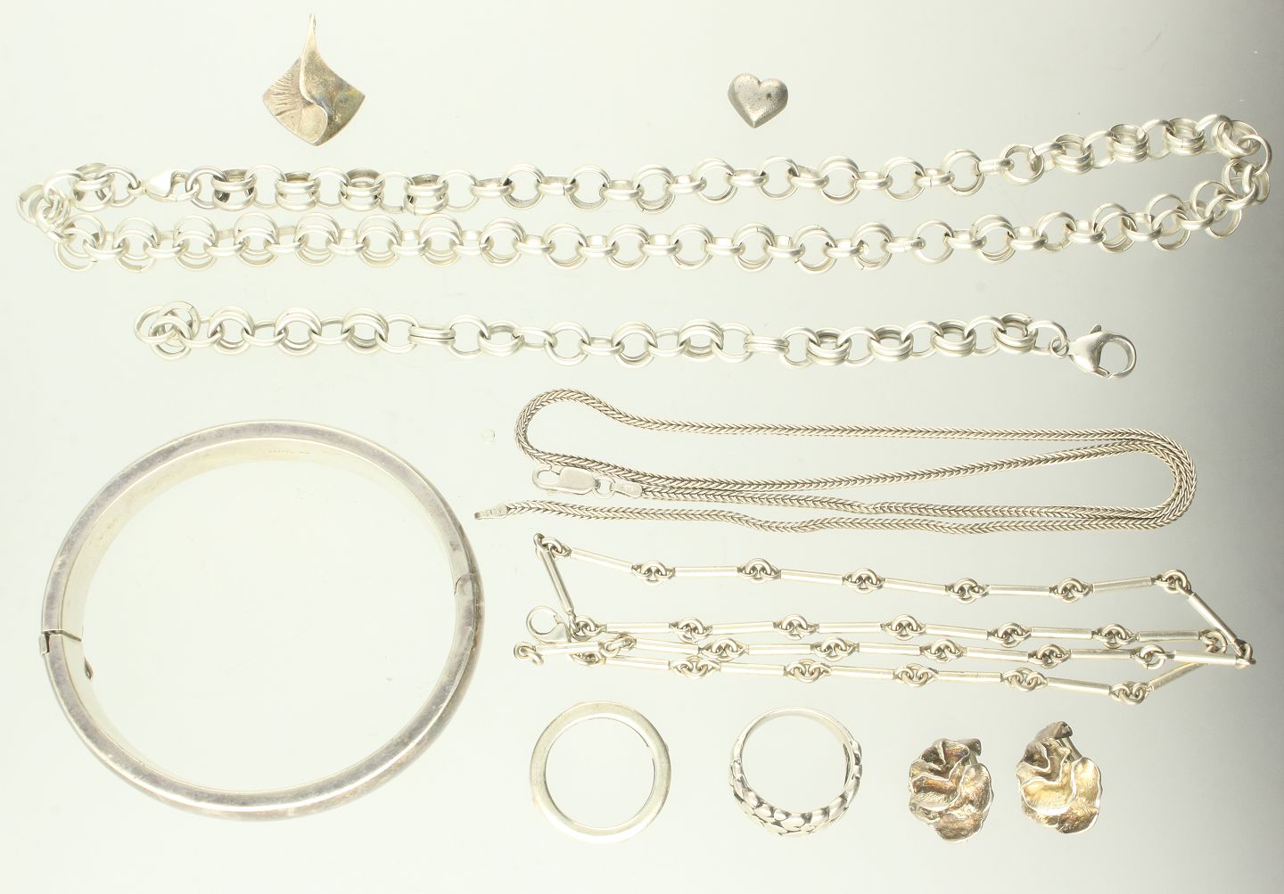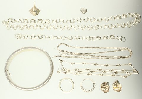 Et par øreclips, to vedhæng samt to ringe. Ringstr: 55-56.