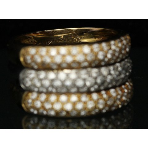 Tre-farvet brilliantring udført af 18 kt. guld prydet med talrige brillanter på i alt ca. 1.00 ct. Ringstr. 55. Vægt: ca. 11,98 gr. Leveres i smykkeæske.
