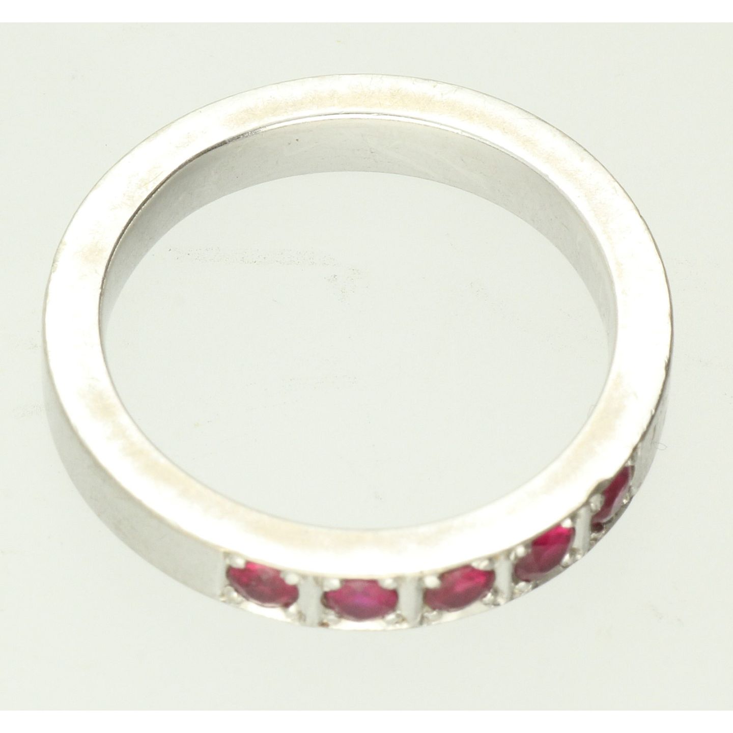 Alliancering udført af 14 kt. hvidguld fattet med fem røde sten. Ringstr: 53. Vægt: ca. 5,63 gr.