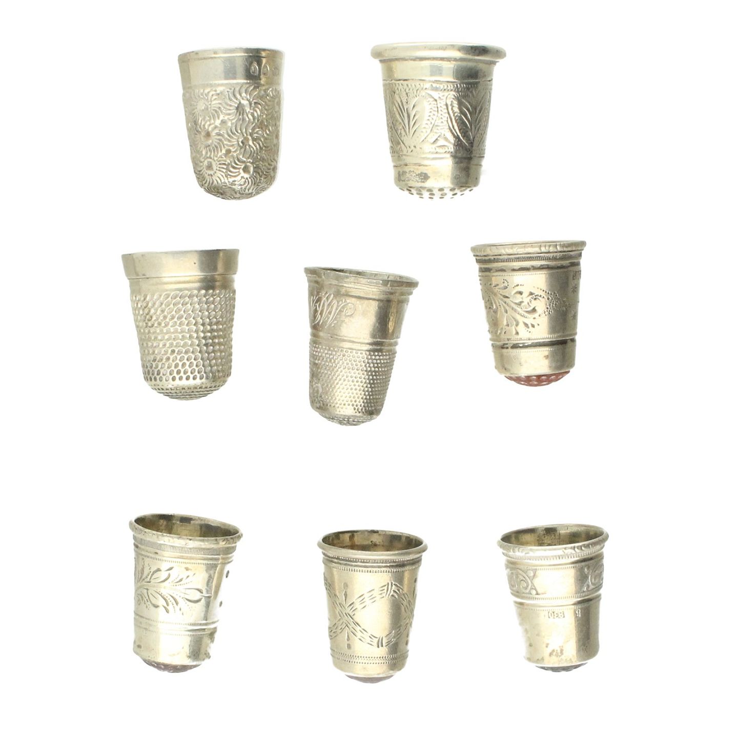 Samling på otte fingerbøl af sølv, heraf fire stk. fattet med farvet sten i enden. H. ca. 2-2,2 cm. Samlet vægt: ca. 37 gr.