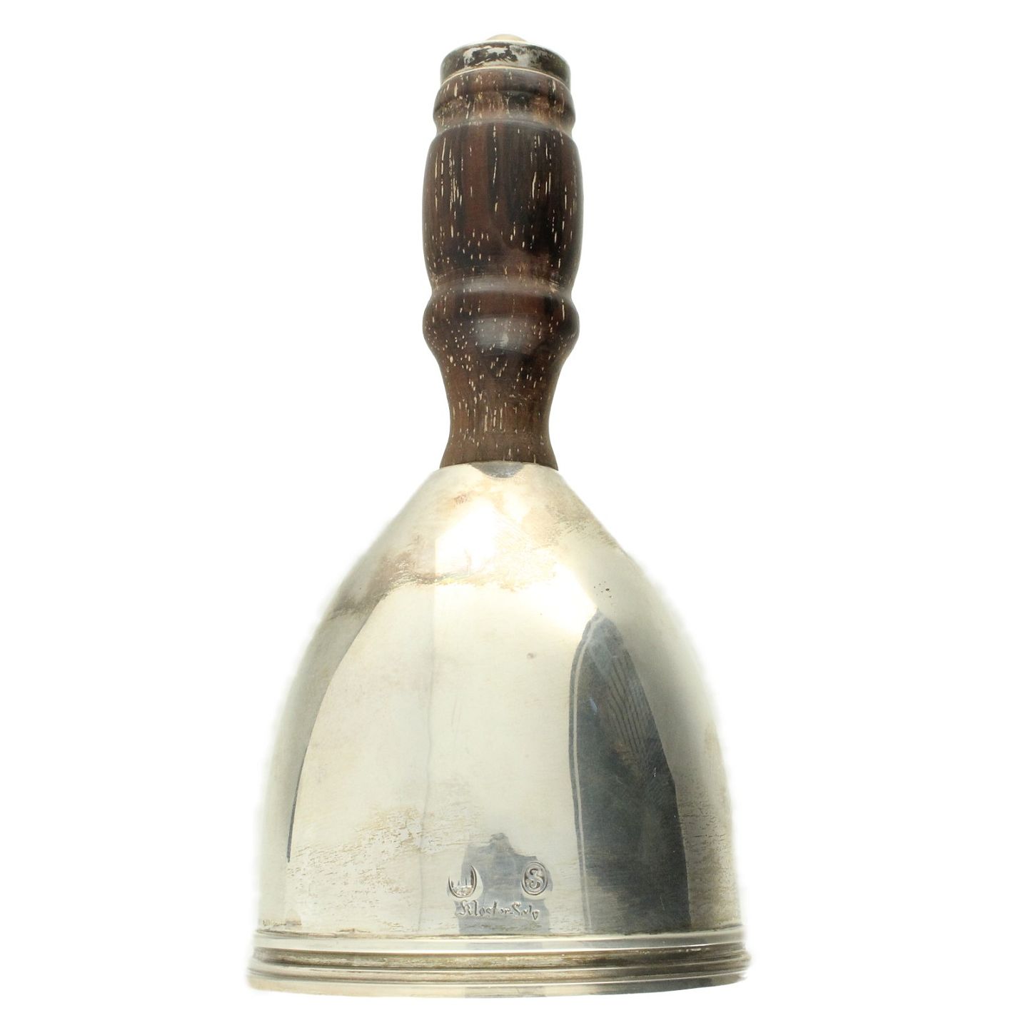 Bordklokke af tretårnet sølv med skaft af træ. H. ca. 14 cm. Totalvægt: ca. 158 gr.