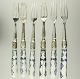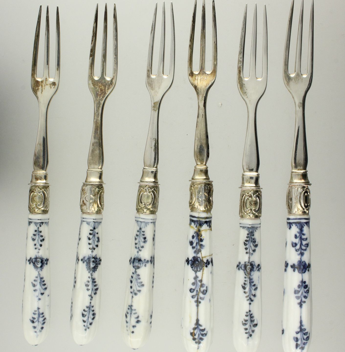 Seks musselmalet pålægsgafler med skafter af 800 sølv. L. 19,7 cm.