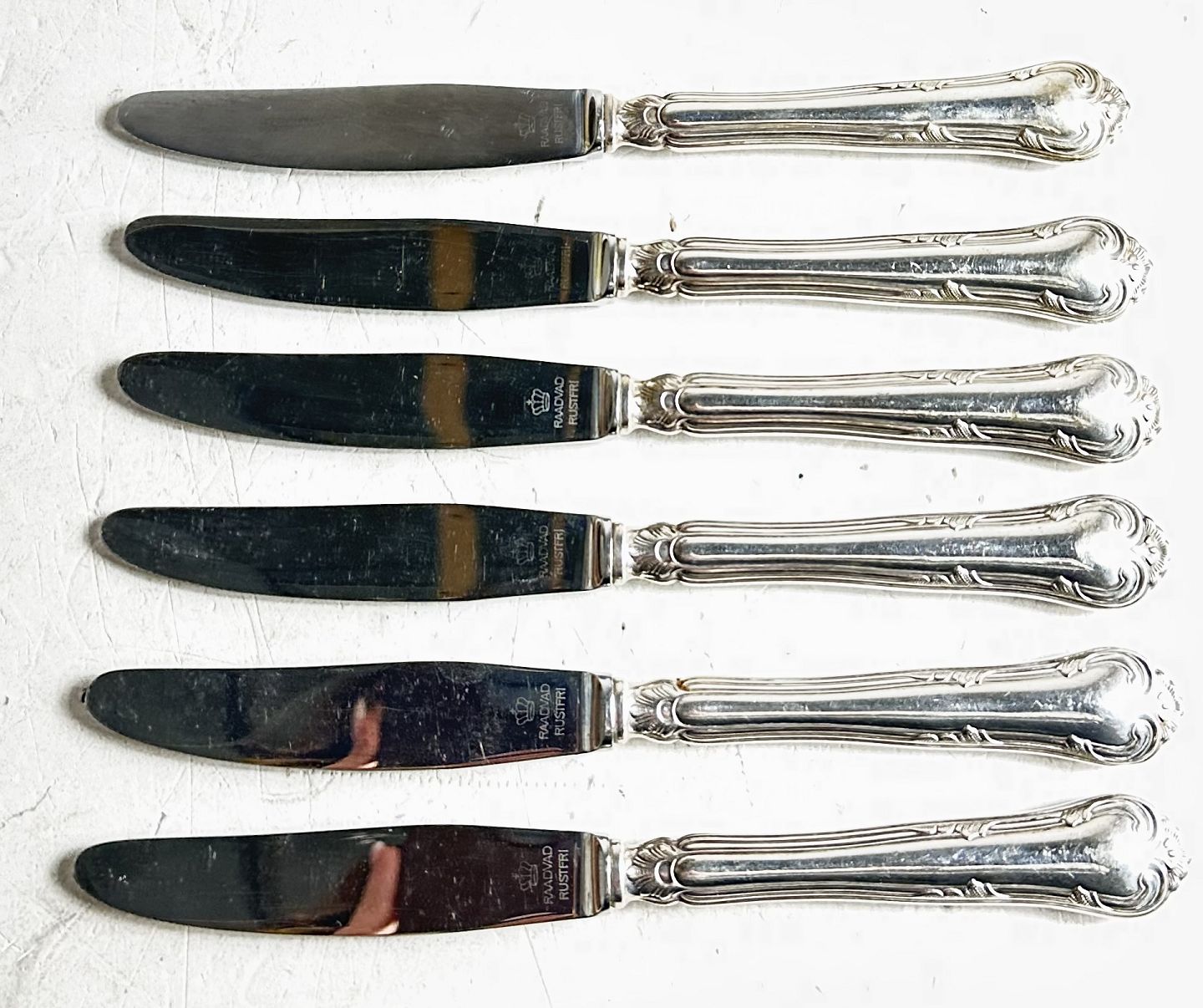 Carl M. Cohr - 'Herregaard' seks middagsknive med skafter af 830 sølv, blade af stål. L. 18, 5 cm.