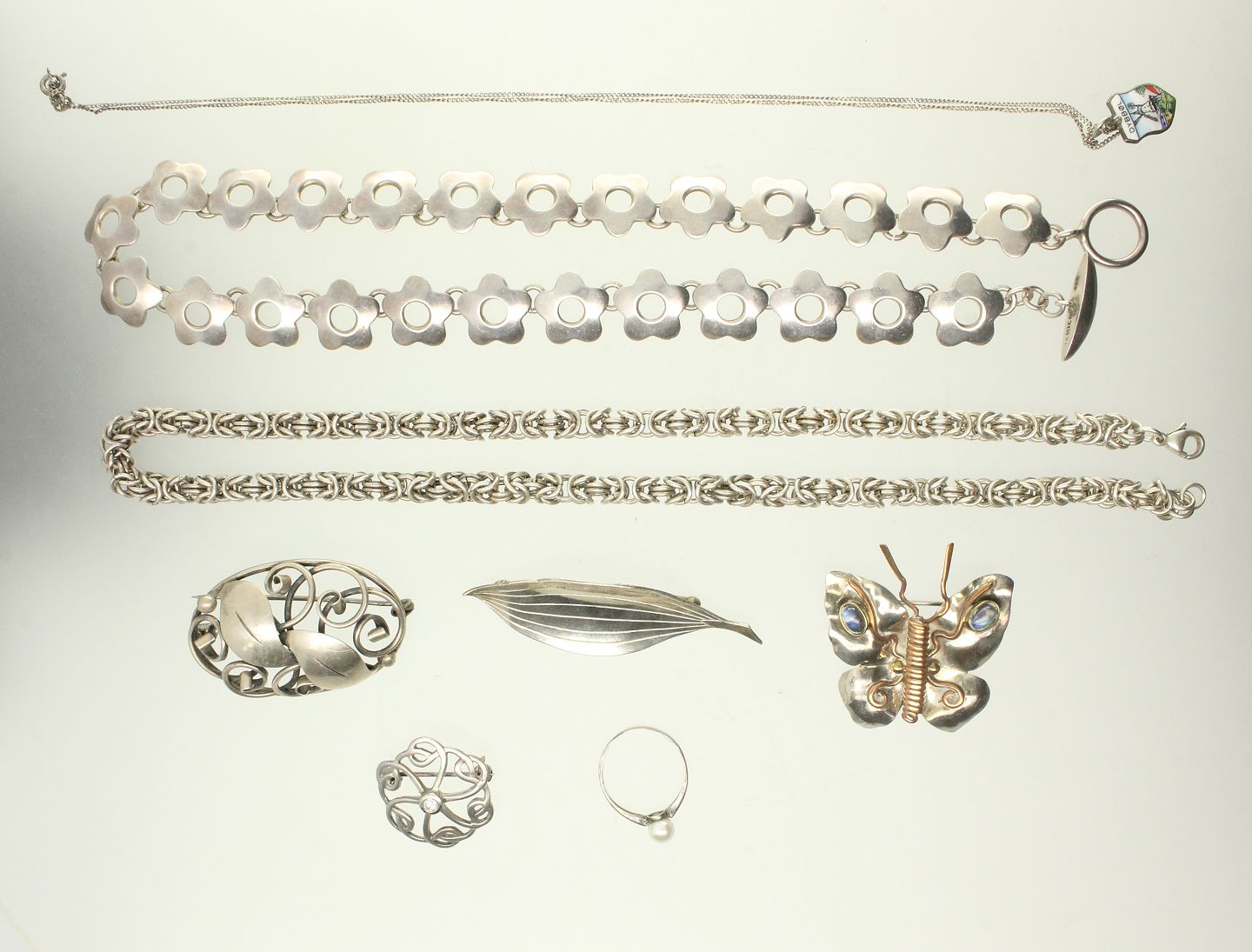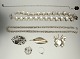To halskæder, fire brocher samt en ring fattet med perle. Ringstr: 52.