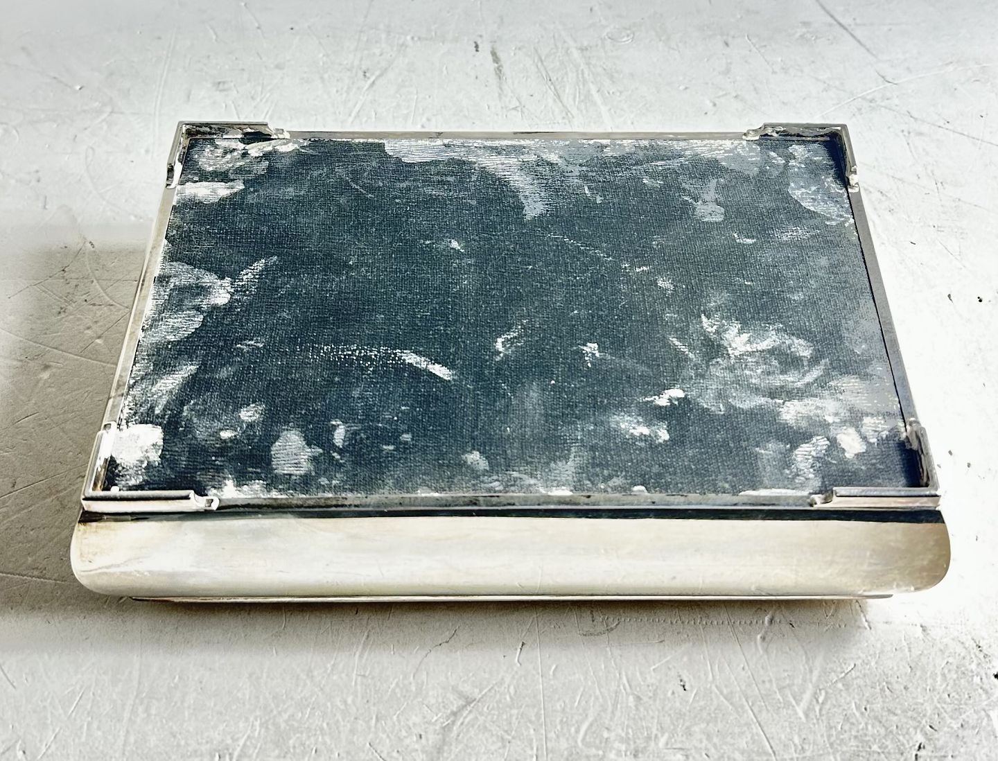 Skrin / æske af 830 sølv med indsats af træ og bundplade af metal. Mål: H. 5,7 B. 23,5 D. 15,5 cm.