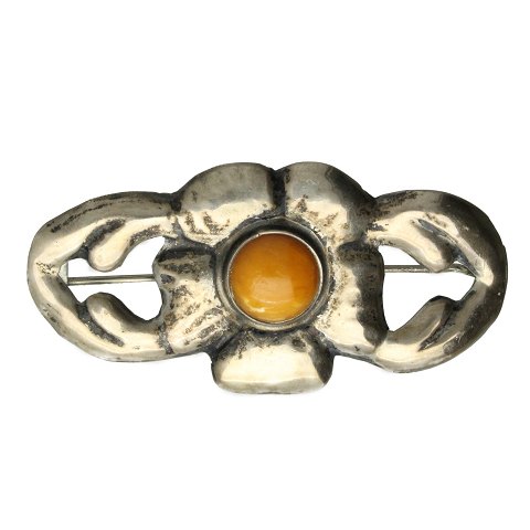 Skønvirke broche af 830 sølv fattet med rav. L. 5,5 cm. Vægt: ca. 6,4 gr.