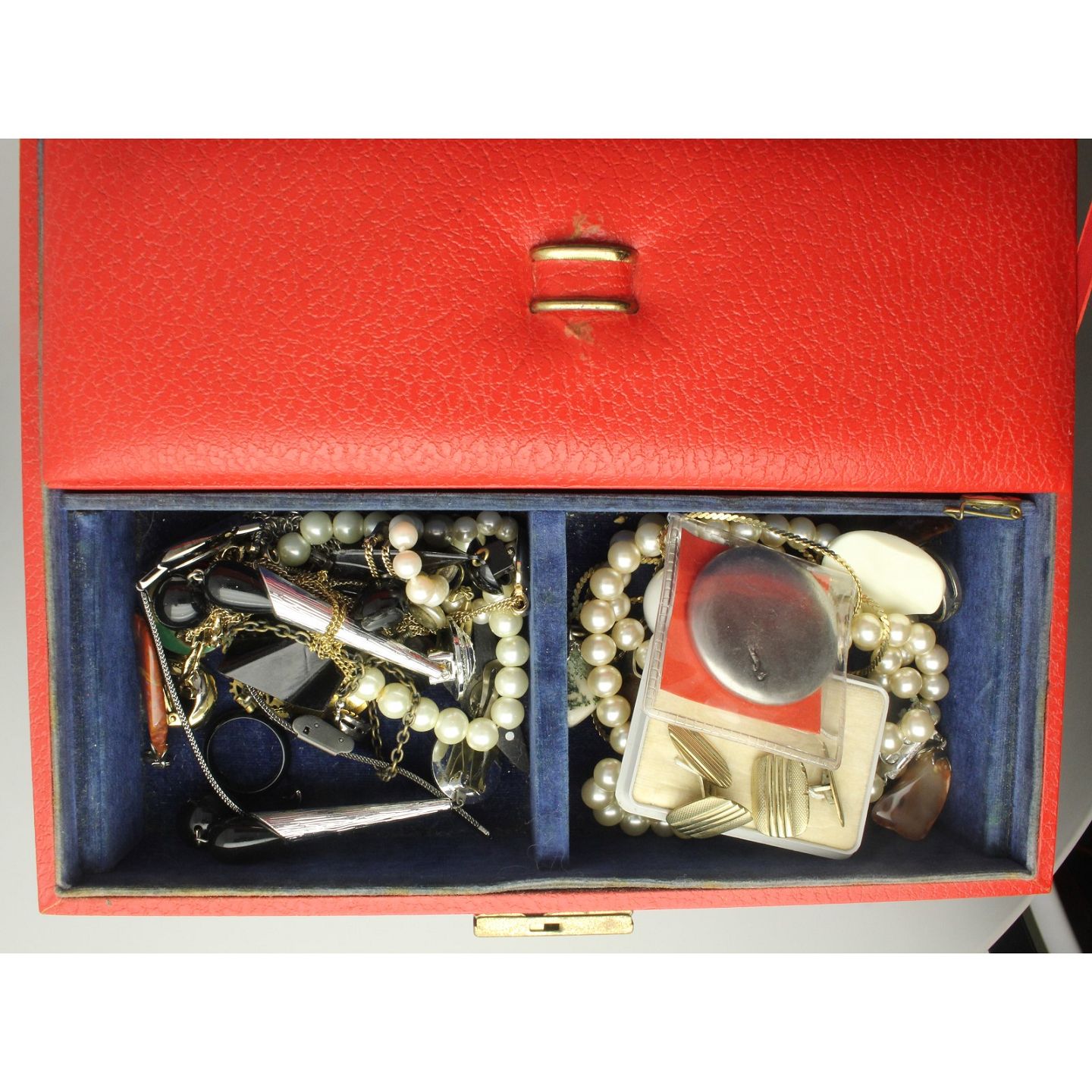 Smykkeskrin med diverse bijouteri smykker bl.a. bestående af: diverse øreclips, perlekæder, HK damearmbåndsur samt halskæder af forgyldt metal.