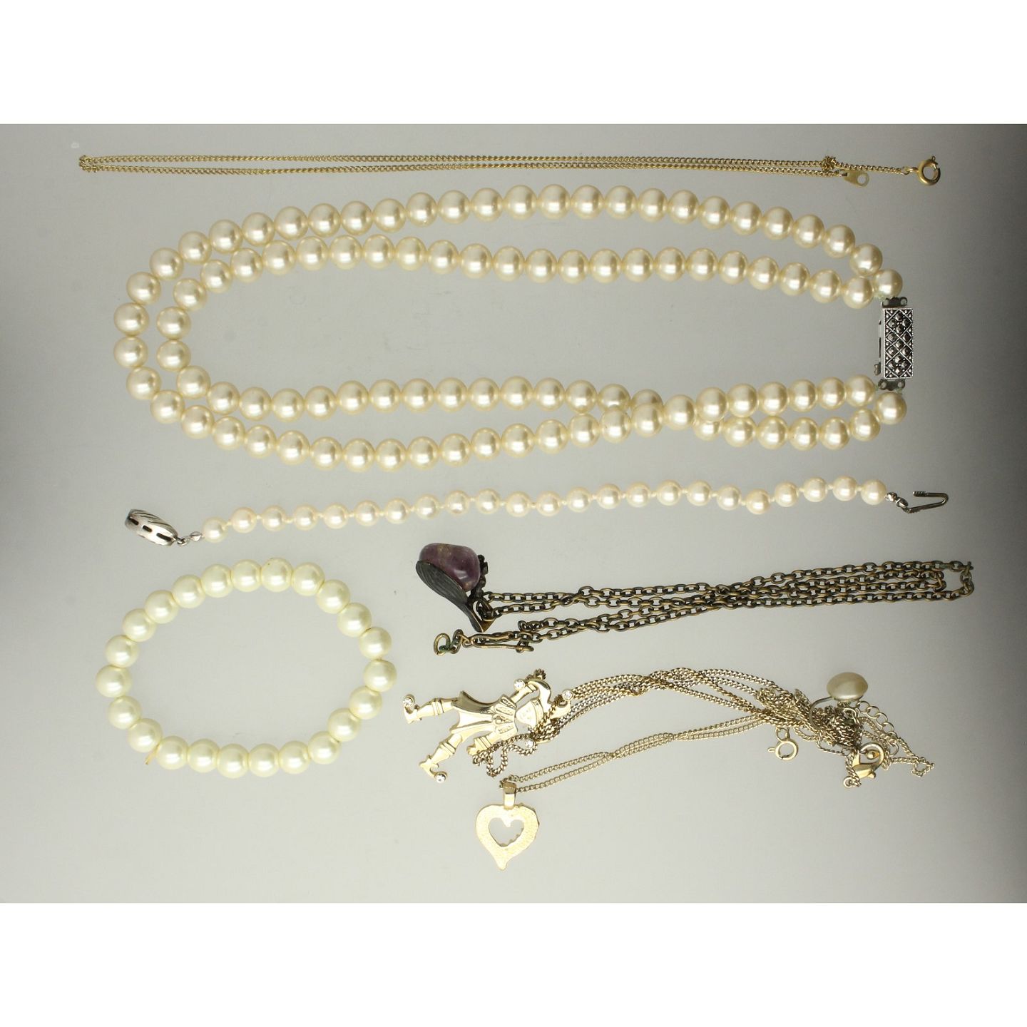 Smykkeskrin med diverse bijouteri smykker bl.a. bestående af: diverse øreclips, perlekæder, HK damearmbåndsur samt halskæder af forgyldt metal.