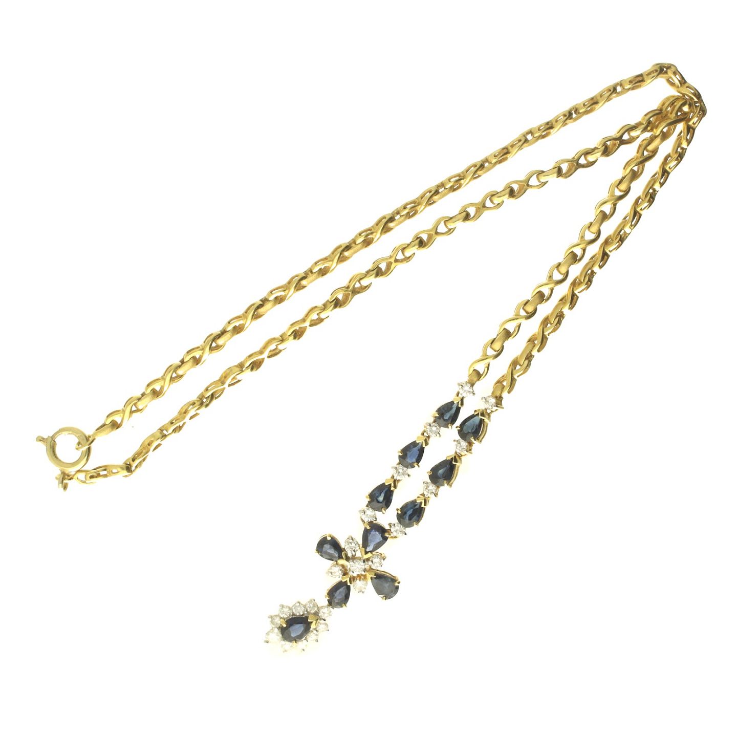 Safir- og brillanthalskæde af 14 kt. guld. L. 43 cm. Vægt: ca. 30,22 gr.