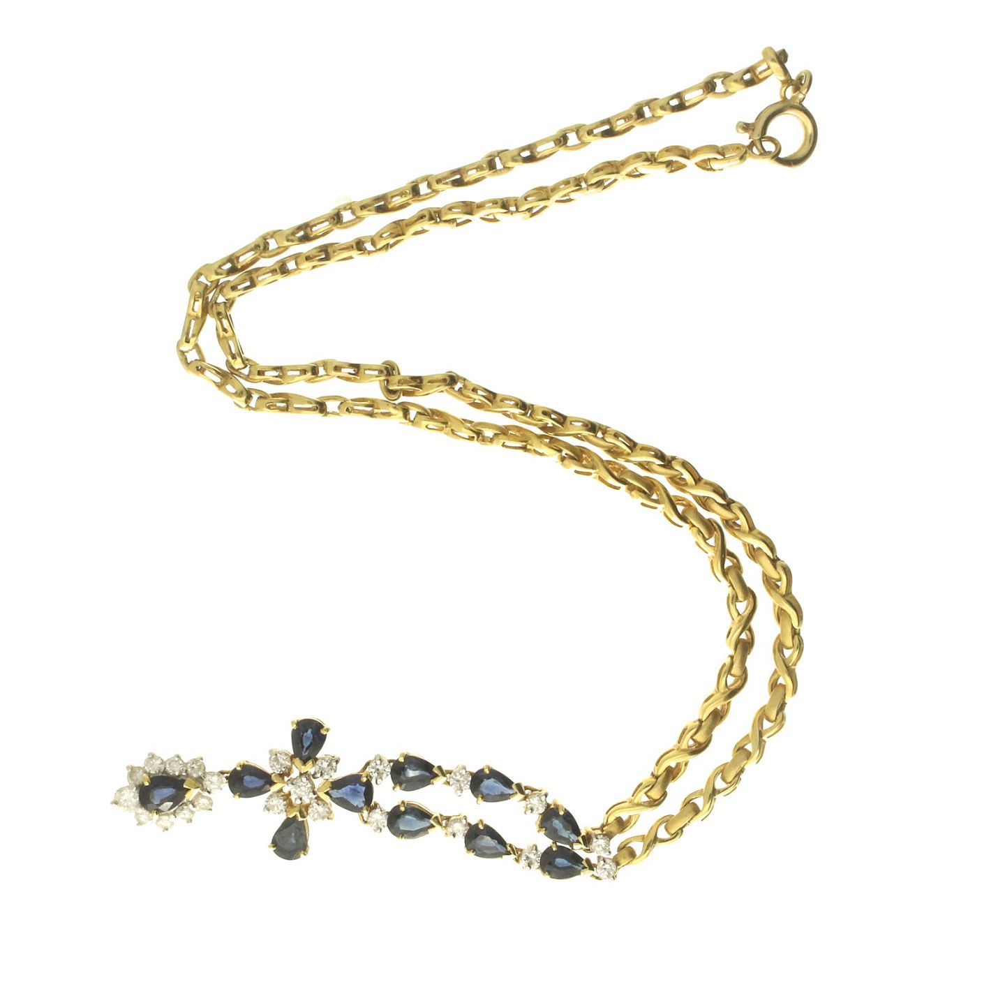 Safir- og brillanthalskæde af 14 kt. guld. L. 43 cm. Vægt: ca. 30,22 gr.