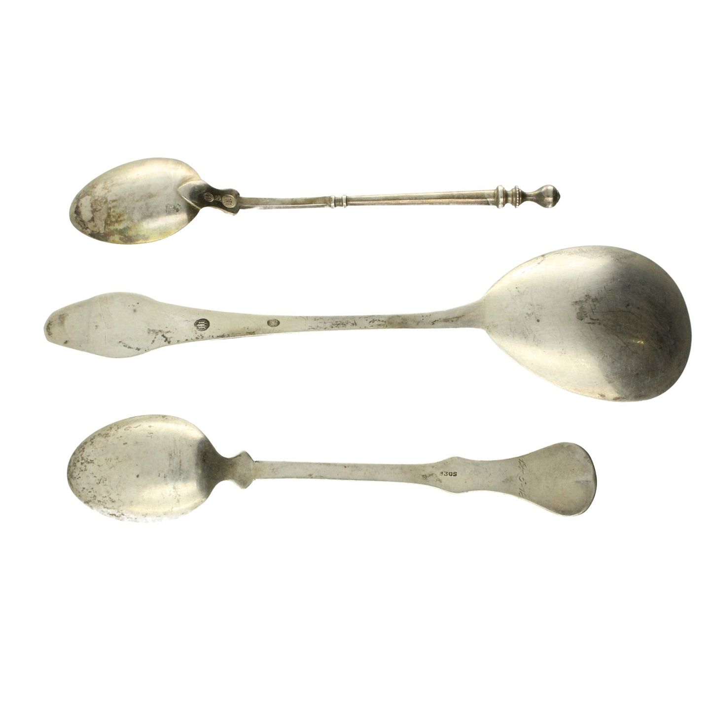 Tre skeer af tretårnet sølv bestående af to teskeer samt en marmeladeske. L. 11-14,5 cm. Samlet vægt: ca. 39 gr.
