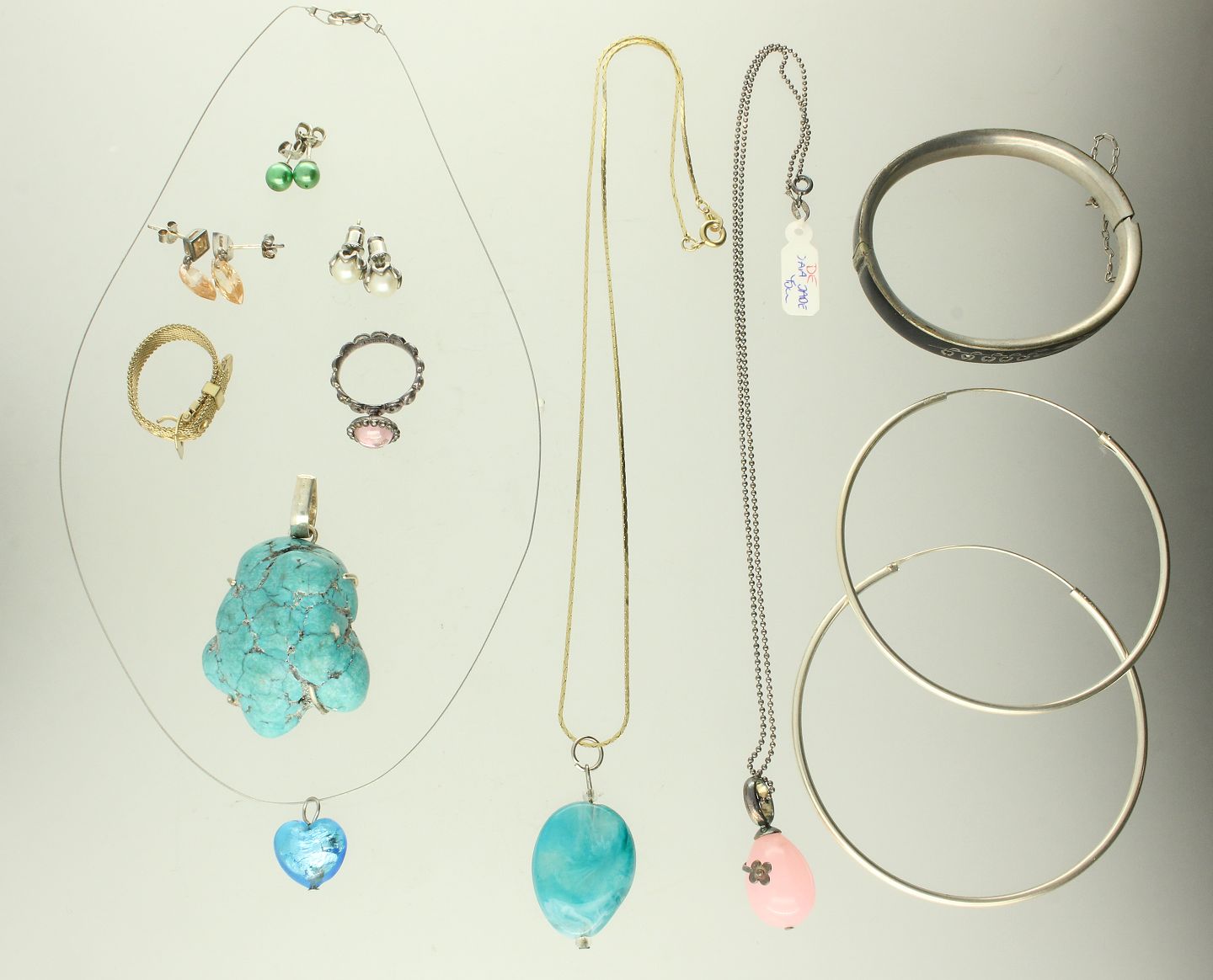 Samt tre par ørestikker, en armring, tre halskæder inkl. vedhæng samt en ring.