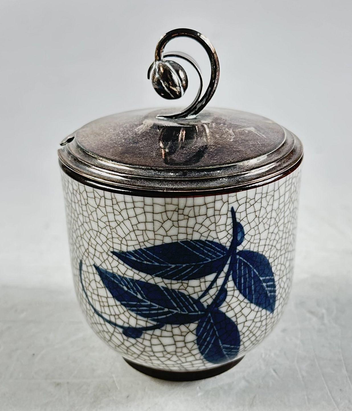Bing & Grøndahl - Krakelé sennepskrukke med blå dekoration dessin nr. 612. H. uden låg: 8 cm. Låg af sterling sølv, stemplet Hugo Grün, 925S. Ø. 8,5 cm. Vægt: ca. 38 gr.