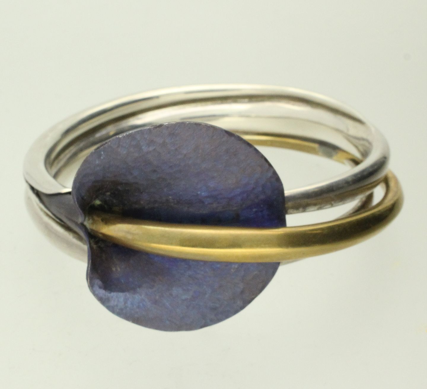 Armring af sølv og forgyldt sølv dekoreret med blå blomst. Ø. ca. 7,5 cm. Totalvægt: ca. 63,6 gr.
