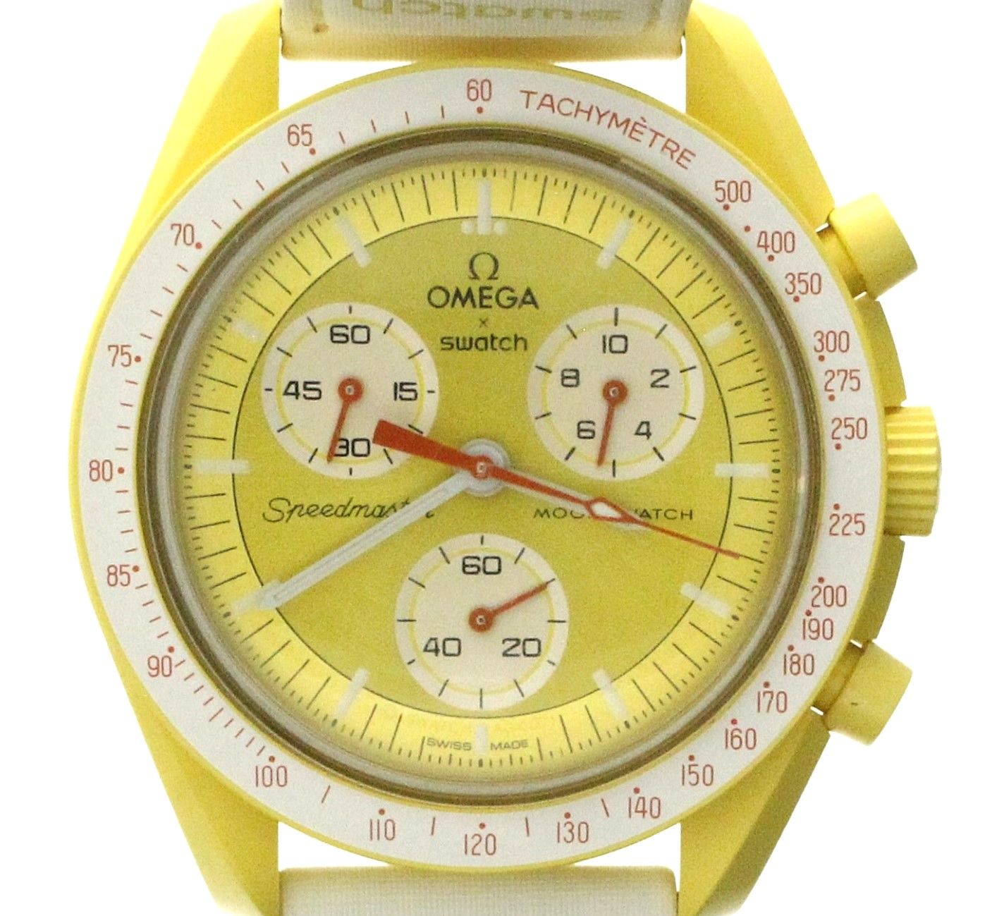 Swatch x Omega - Herrearmbåndsur model Speedmaster Moonswatch Mission to the sun, i urkasse af keramik, gul skive med stregindeks, separat sekundviser, stopursfunktion, tachymeter-krans, plexiglas. Monteret med original hvid rem med velcro, quartz urværk. Ø. 42 mm.
