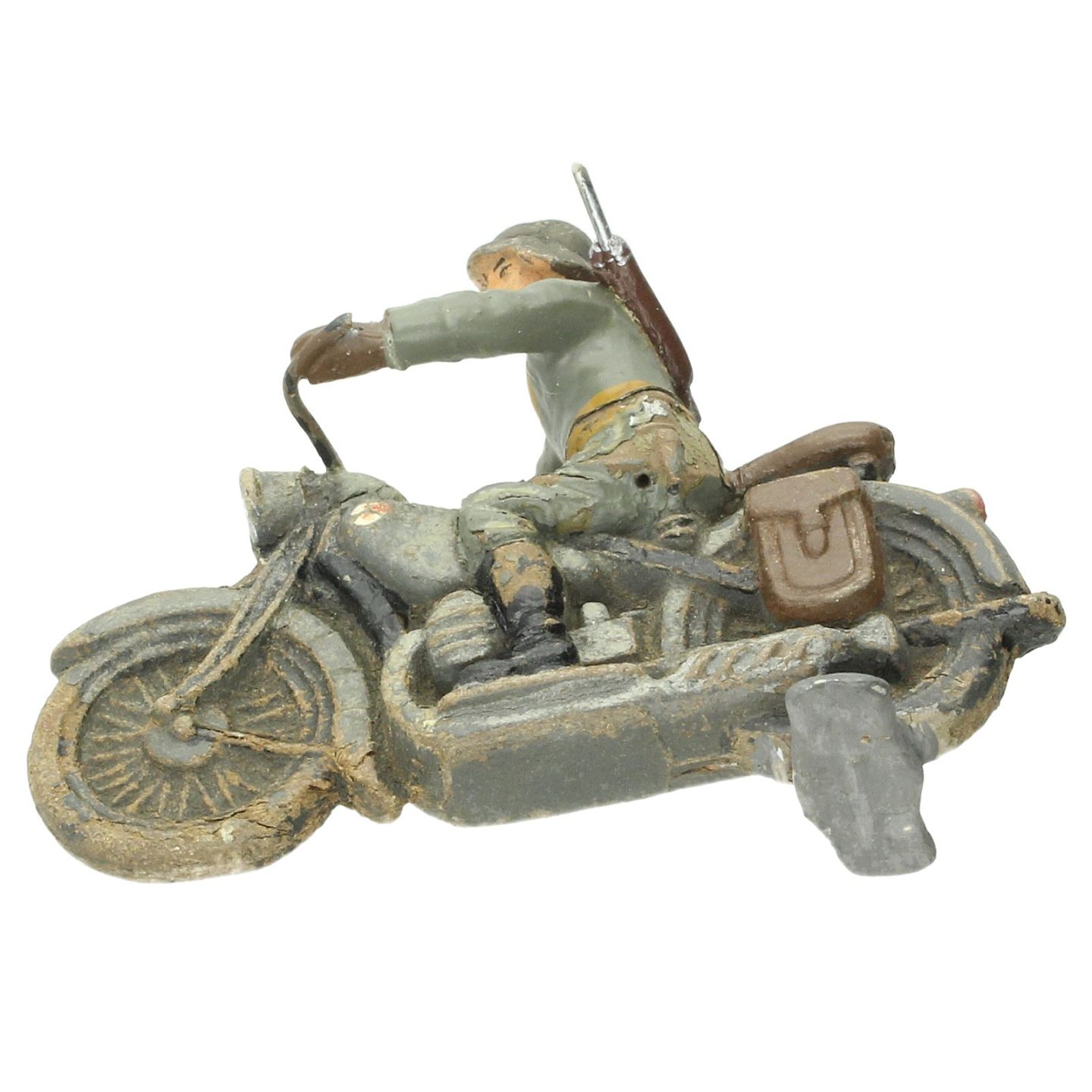 Ældre soldat på motorcykel. L. ca. 9,5 cm. Soldat fremstår med større revne samt afskalninger.