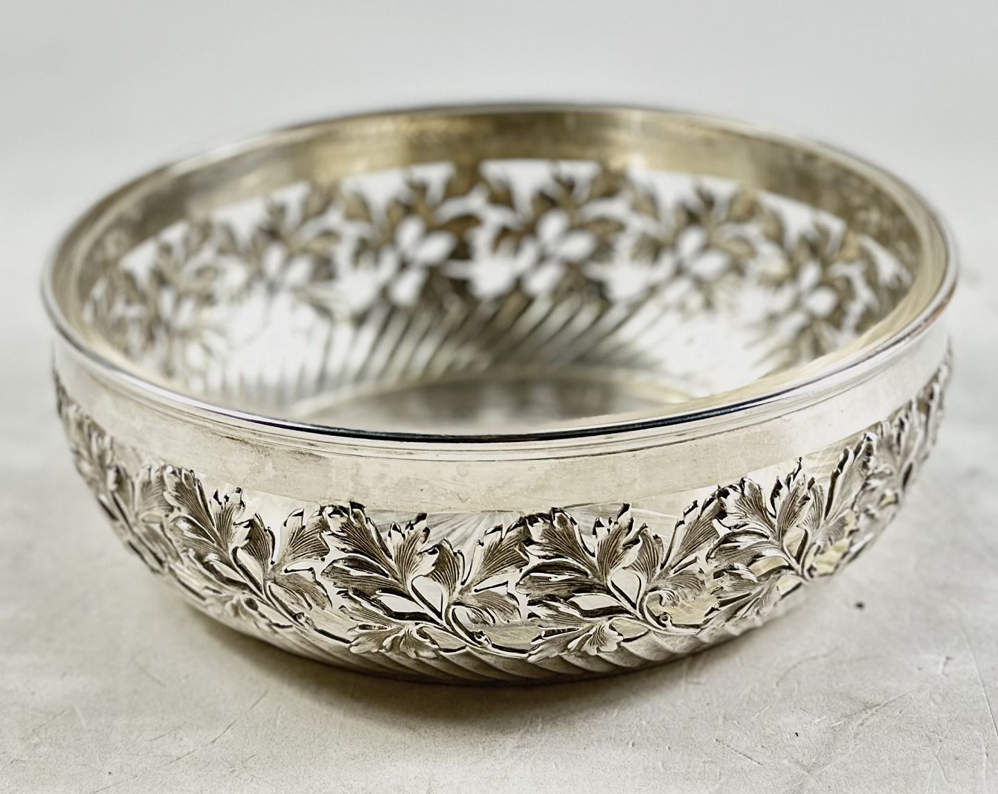 A. Dragsted - Frugtskål af sølv med glas indsats år 1907. Ø. 18 cm. Vægt uden indsats: ca. 316,5 gr.