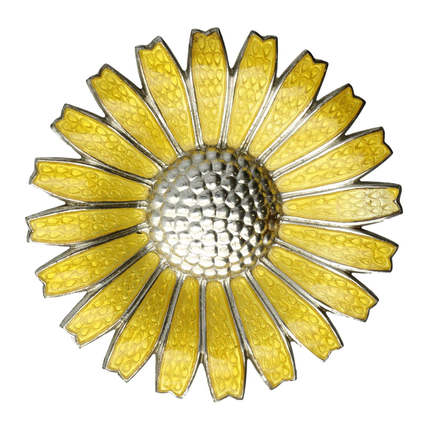 Georg Jensen - Daisy / marguerit broche udført af sterling sølv og gul emalje. Ø. ca. 42 mm. Vægt: ca. 16 gr. Stemplet GJ efter 1945, 925S.