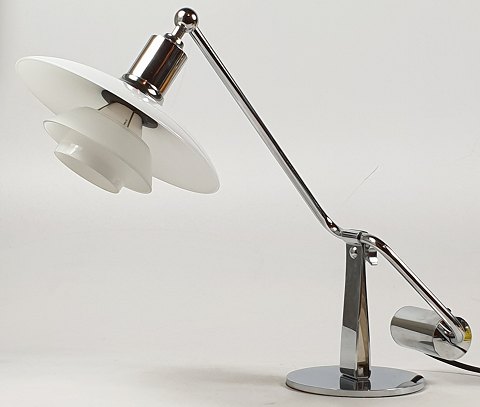 Poul Henningsen, PH 2/1 bordlampe med skærme af hvidt opalina glas, fod og arm af forkromet metal. Afbryder i kontravægten. Fremstillet hos Louis Poulsen. H. ca. 36 cm., L. ca. 50 cm.