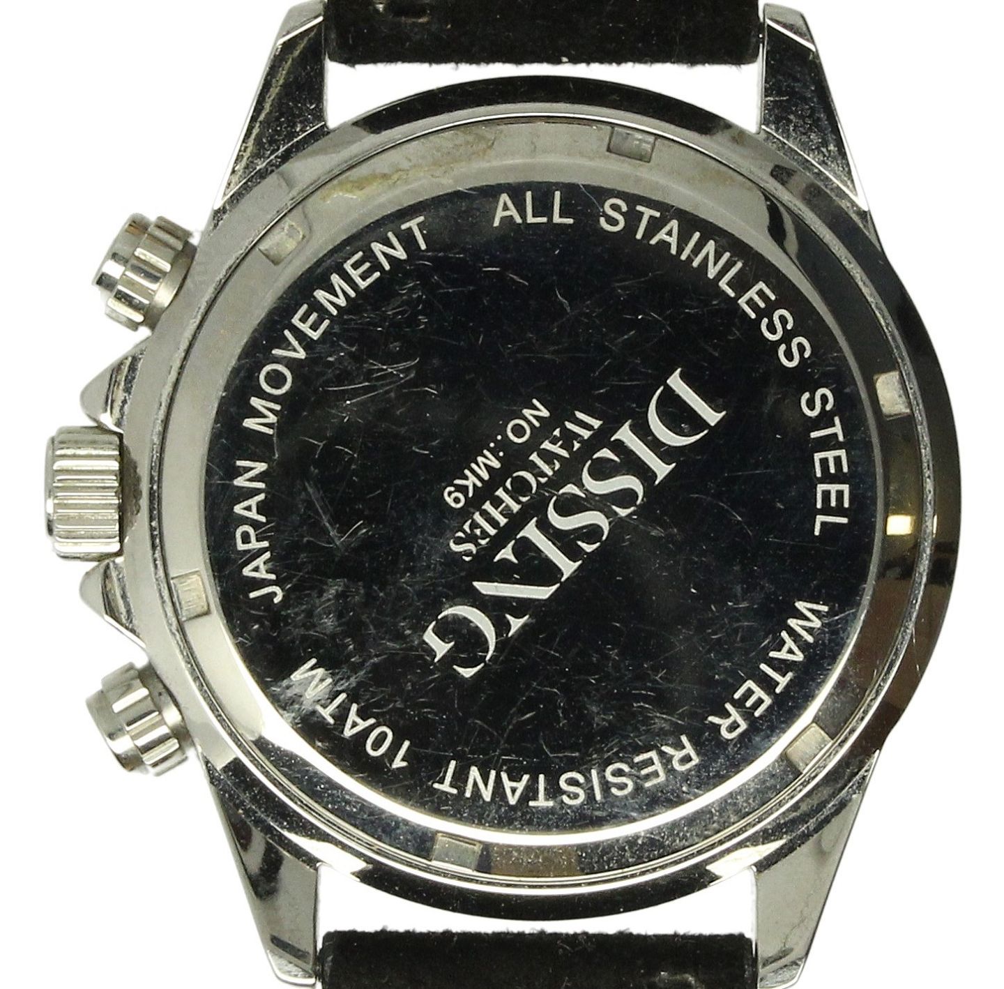 Uret har en mørk blå skive med analog, chronograph og datovindue. Safirglas.
