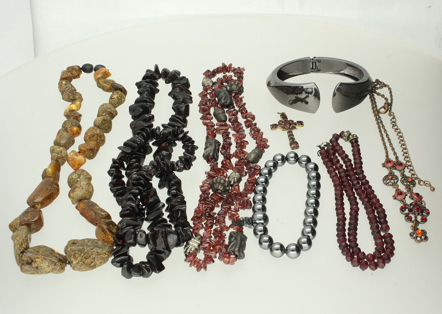 Tre rav halskæder, to diverse kæder, en armring, et armbånd, et kors fattet med granater, to ringe, et par øreringe samt en rav broche med fatning af sølvholdigt metal.