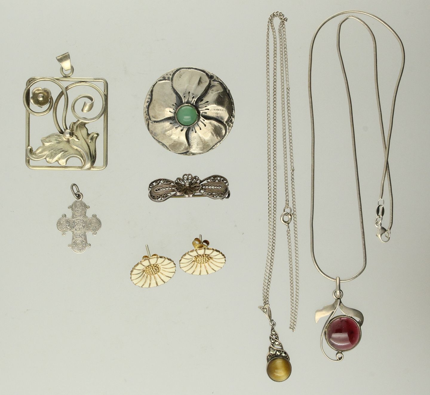 Et skønvirke vedhæng, tre vedhæng blandt andet et dagmar kors, to halskæder, to brocher samt et par marguerit ørestikker.