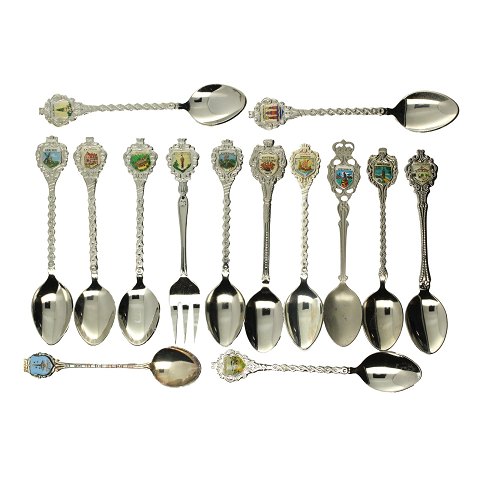 Samling på 13 souvenirskeer samt enkelt gaffel, primært fra danske byer eksempelvis København, Frederikshavn og Aalborg