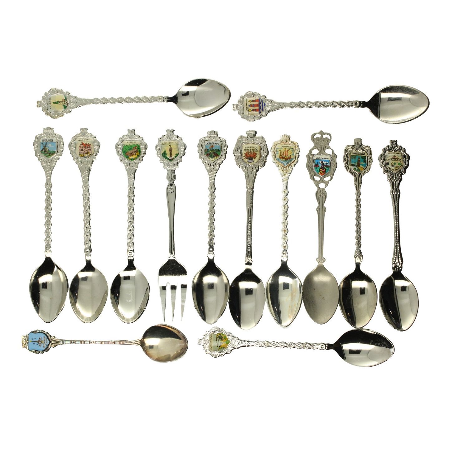 Samling på 13 souvenirskeer samt enkelt gaffel (14)