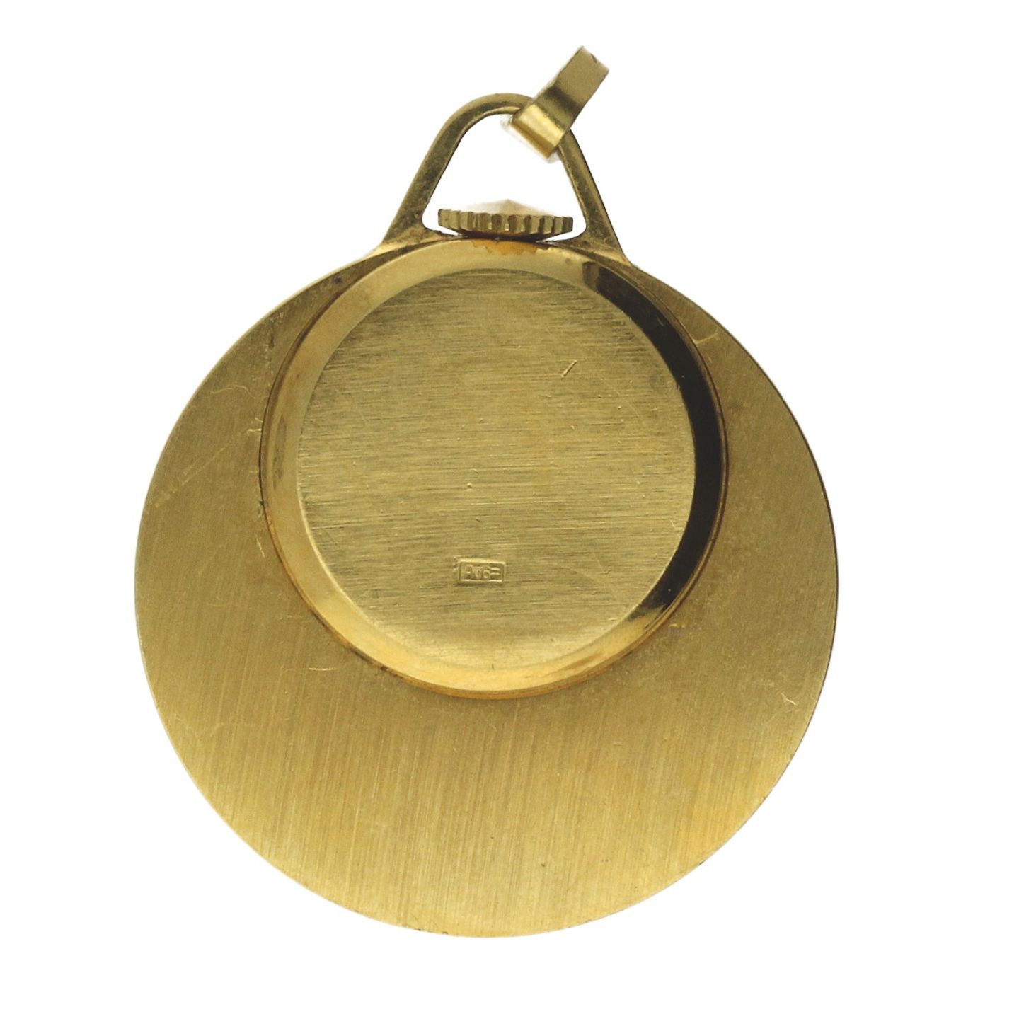 Damelommeur i urkasse af forgyldt metal med blå skive, stregindikation og central sekundviser. Manuel mekanisk urværk. Urkasse diameter ca. 30 mm.